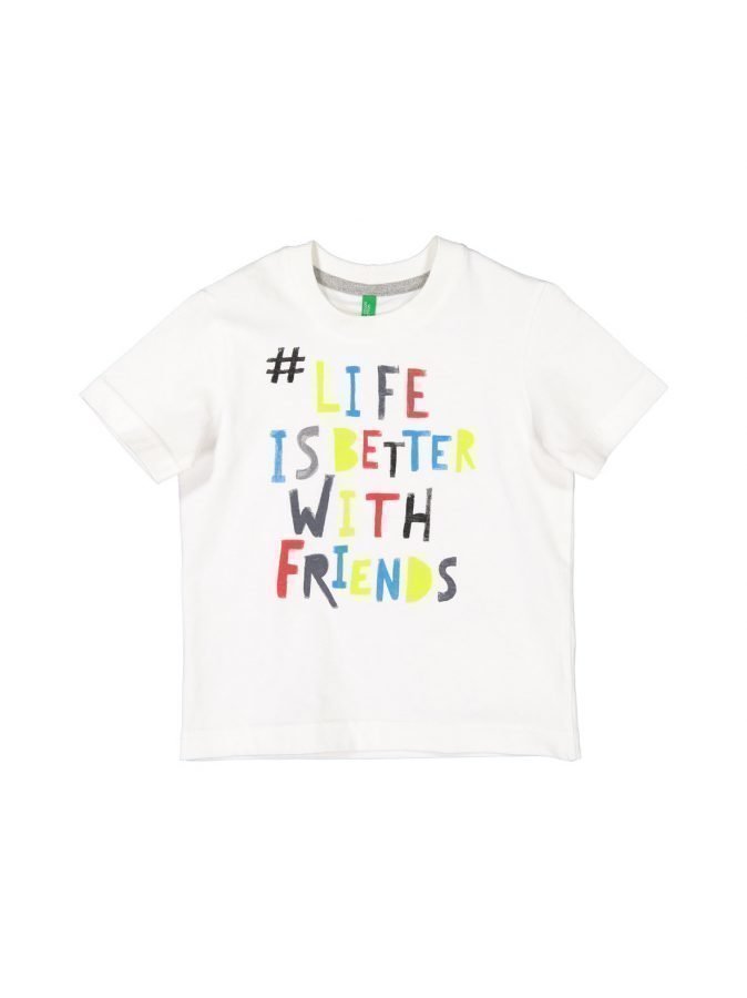 Benettonin mukavaa t-paitaa koristaa iloisen värikäs printti. Materiaali on pehmeää puuvillaa.