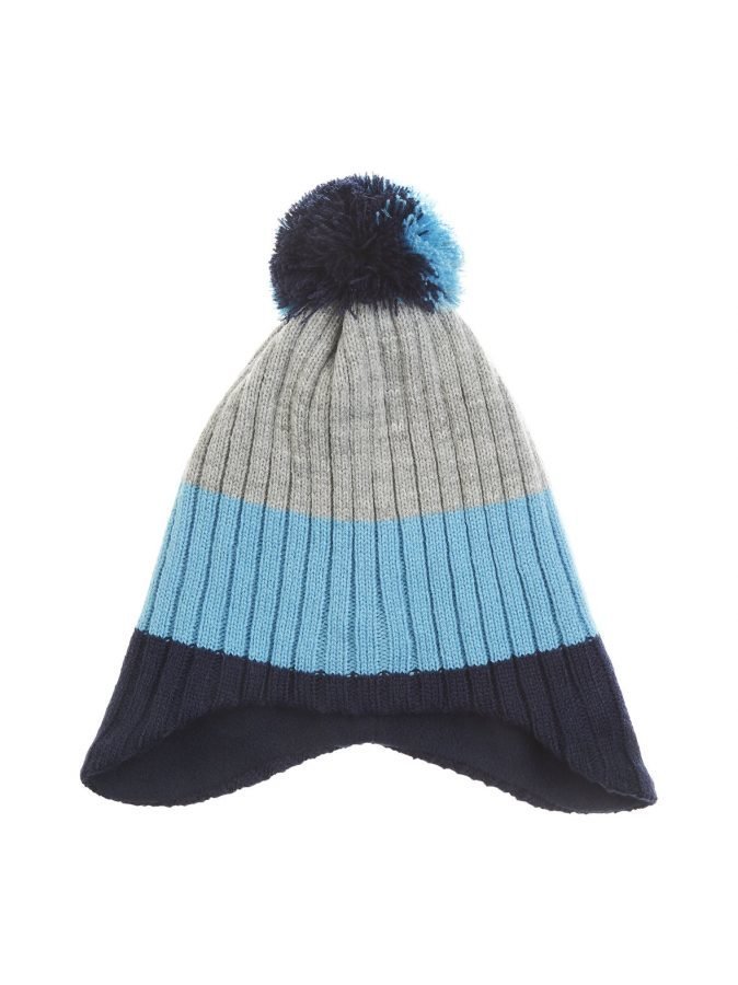 Joustoneulotun raitapipon madalletut reunat suojaavat hyvin myös korvia. Päällä on kolmivärinen tupsu. Sisäpuolella on pehmeä ja lämmin fleecevuori. Päällysmateriaali on 100 % akryylia, vuori on 100 % polyesteriä. Konepesu 30 °C.