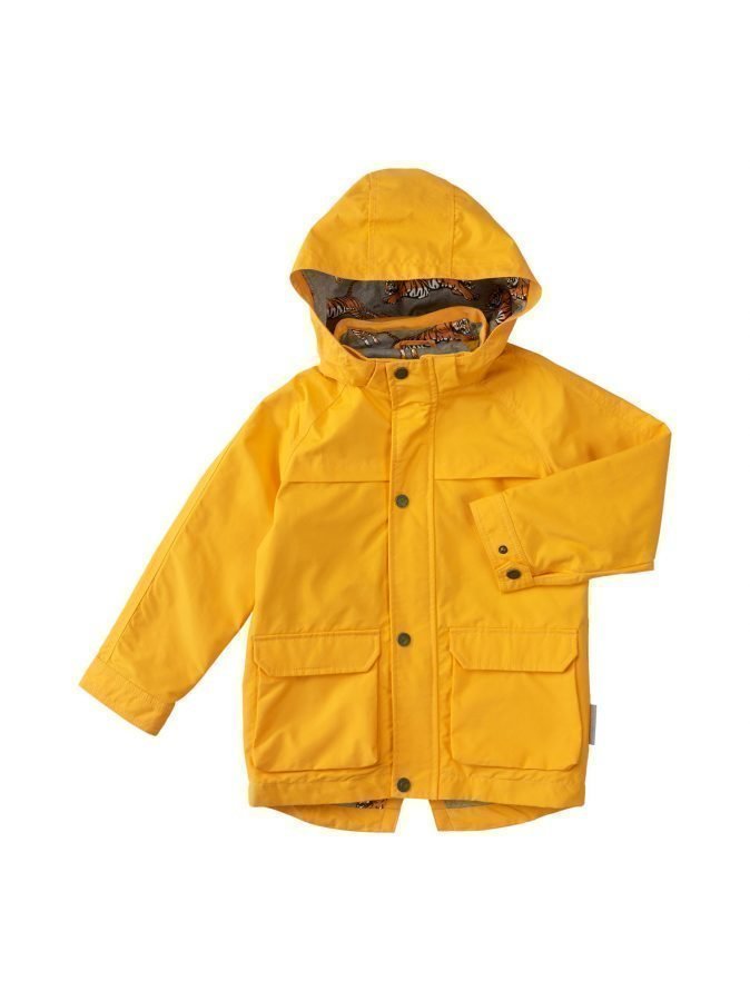 Pirteässä parkatakissa on painonapilliset etutaskut ja helmahalkio takana. Hihansuita voi kiristää painonappien avulla. Hupussa ja takin sisäpuolella on pehmeä vuorikangas, jossa on veikeä tiikerikuosi. Takki suljetaan vetoketjulla ja painonapeilla.