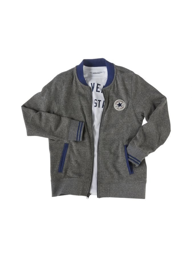 Pehmeä collegetakki suljetaan pitkällä vetoketjulla. Sivutaskujen, hihansuiden ja pääntien ympärillä on tehosteväriä. Selkäpuolella on kookas logosomiste.