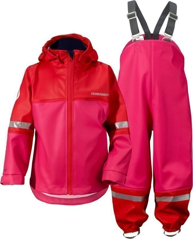Didriksonsin kaksiosainen sadeasu Galon®-materiaalia. Tuulen- ja vedenpitävä sadeasu, jossa hitsatut saumat. Materiaali on neljään suuntaan joustavaa. Takissa on huppu, vetoketju edessä, säädettävät hihansuut sekä heijastimet hihoissa ja selässä. Housuissa on säädettävät olkaimet, joustavat lahkeensuut ja saapaslenkit sekä heijastimet lahkeissa. – Tuulenpitävä – Vedenpitävä – Hitsatut saumat – Säädettävät olkaimet – Saapaslenkit – Heijastimet – Vesipilari: 8000 mm (kolmen pesun jälkeen 5000 mm) Materiaali: 100 % PU Huom. Huomioi kokoa valitessa, että Didriksonsin mitoitus on melko reilu.