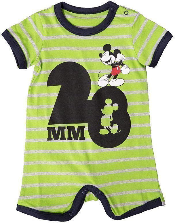 Vihreä Disney Mickey Mouse -body, jossa harmaat raidat. Lyhythihainen body pehmeää ja päällä mukavaa puuvillaa. Rinnassa suurikokoinen Mikki Hiiri -painatus ja toisella olkapäällä pukemista ja riisumista helpottavat painonapit. Materiaali: 100 % puuvilla