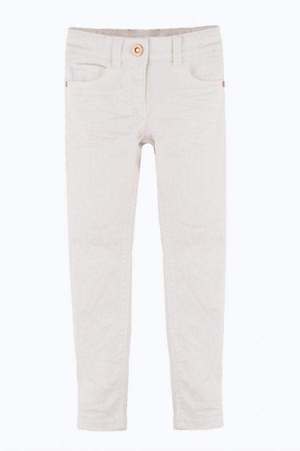 Luonnonvalkoiset Esprit-farkut miellyttävää stretchdenimiä. Viistaskumalli. Kuparinväriset niitit ja kuparinvärinen nappi. Vetoketju etuhalkiossa. 98% puuvillaa, 2% elastaania Istuvuus: slim Pesu 30°.