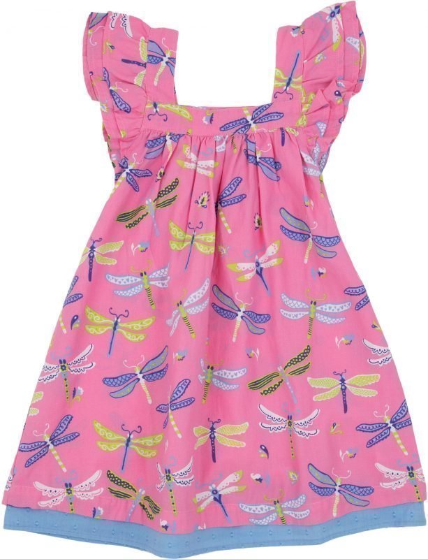 Hatleyn sievä mekko, jossa kivannäköinen sudenkorentokuvio. Kesäinen mekko, jonka helmassa ja leveissä olkaimissa röyhelöt. Materiaali: 100 % puuvillaa