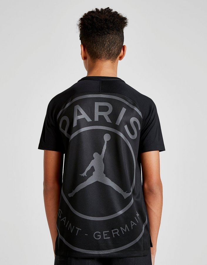 Show your support with a standout style in this juniors’ Paris Saint Germain T-Shirt from Jordan. In a slick, all-black colourway, this short sleeve tee shirt is made from a smooth polyester fabric with a crew neckline for an essential look. With the club crest stamped to the front, this tee is finished with large Paris Saint Germain and Jumpman branding to the back in grey.