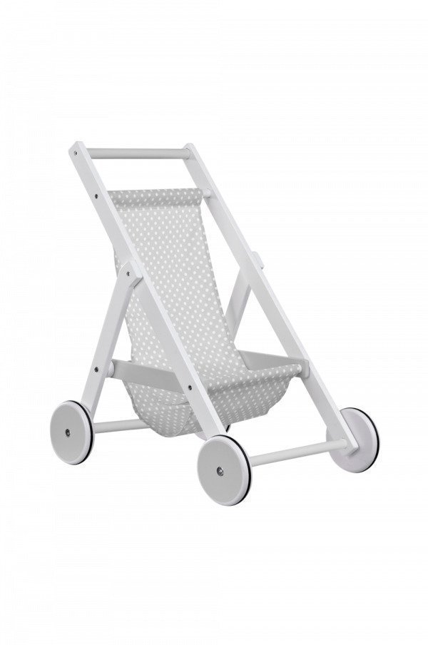 Suloiset puiset nukenrattaat. Rattaissa on harmaa työntöaisa ja istuinosa harmaata, valkopilkullista kangasta. Renkaissa melua vaimentava kumireunus. Rattailla on mukava työnnellä nukkea tai pehmolelua. Mitat: 44 x 32,5 x 51,5 cm. Materiaali: mäntyä/ puuvillapolyesteriä/kumia Suositusikä: alk. 3-vuotiaille. Varoitus! Ei sovi alle 3-vuotiaille. Sisältää pieniä osia, jotka aiheuttavat tukehtumisvaaran.