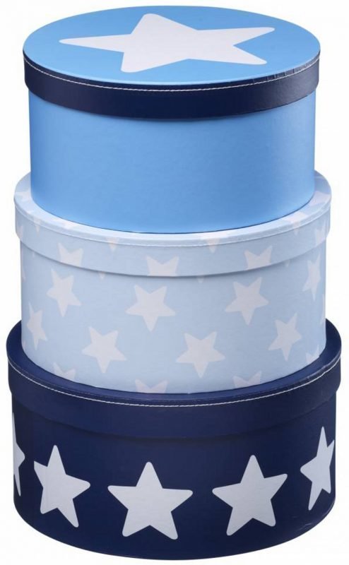 Kids Conceptin pyöreät pahvirasiat, kolmen rasian setti. Kivannäköiset siniset säilytysrasiat tähtikuviolla, kolme eri kokoa. Koko (pieni rasia): halk. 24 x kork. 12 cm Koko (keskikokoinen rasia): halk. 26 x kork. 13 cm Koko (iso rasia): halk. 28 x kork. 14 cm