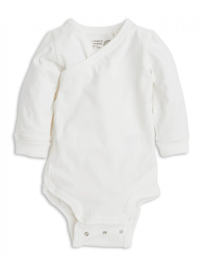 Pitkähihainen, pehmeä body, jossa on päällekkäin menevä etuosa. Bodyssa on käännettävät resorit ja kaksirivinen painonappikiinnitys haarassa, joten vauvan kasvaessa voi sama body olla käytössä pitempään.
