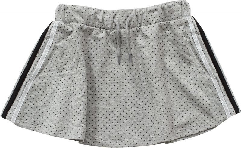 Little Piecesin harmaa hame, jossa mustia pilkkuja. Vyötäröllä resori sekä kiristysnauha. Sivuilla hopeansävyiset yksityiskohdat. Materiaali: 57 % puuvillaa, 43 % polyesteriä
