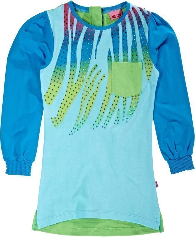 Me Toon pitkähihainen, turkoosi tunika. Pyöreä pääntie, vetoketju takana, iloisenvärinen painatus edessä sekä resorit hihansuissa. Materiaali: 95% puuvillaa, 5% spandexia