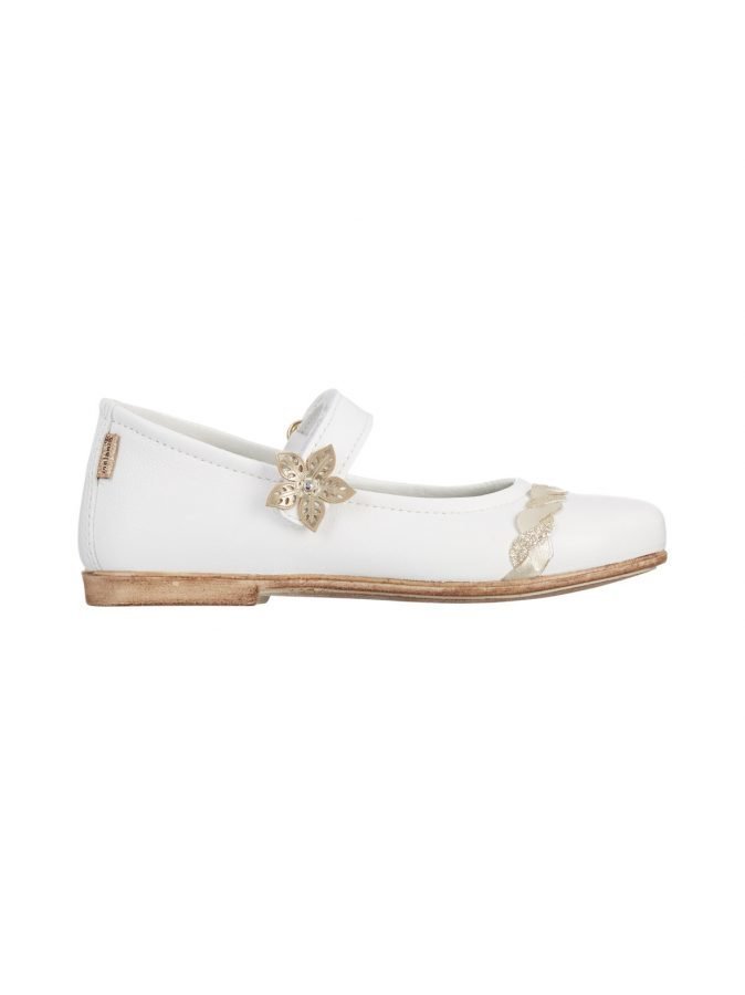 Pyöreäkärkisissä kengissä on kukkasomisteinen tarrahihna, edessä on kimalteleva koristenauha. Kenkien Interactiva-sisäpohjalliset ehkäisevät jalkaongelmien kehittymistä. Päällinen ja sisäpohja ovat nahkaa. Ulkopohja on synteettistä materiaalia.