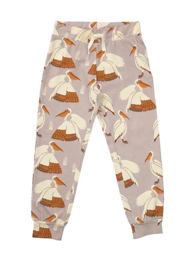 Pehmeissä housuissa on hauska pelikaanikuviointi. Lahkeensuissa on resorit, vyötäröllä on joustava kuminauha ja kiristysnauhat. Materiaali on 95 % luomupuuvillaa ja 5 % elastaania. Konepesu 40 °C.