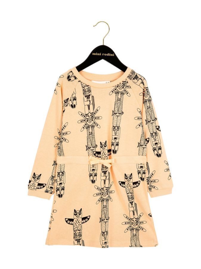 Mini Rodinin suoralinjaista collegemekkoa koristaa upea toteemiaiheinen printtikuosi. Mekon vyötäröllä on resori ja solmittavat nauhat. Ekologisia lastenvaatteita suunnitteleva Mini Rodini haluaa tarjota vastuullisesti tuotettuja, kestäviä ja kauniita vaatteita, joita sekä lasten että aikuisten on helppo arvostaa.
