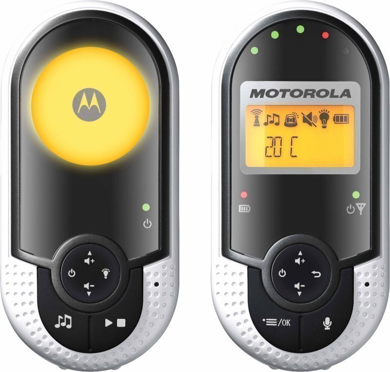 Motorolan helppokäyttöinen digitaalinen itkuhälytin LCD-näytöllä. Itkuhälyttimessä on taustavalolla varustettu LCD-näyttö, joka näyttää mm. huoneen lämpötilan, akun lataustason sekä äänenvoimakkuuden säädön. Vauvan yksikkö on varustettu yövalolla, jonka pehmeä hohde rauhoittaa lasta. Samasta yksiköstä voi soittaa myös kehtolauluja. Vanhemman yksikkö on pienikokoinen ja voidaan kiinnittää vyöhön tai asettaa pöydälle. – DECT-teknologia turvallisella tiedonsalauksella – Kantavuus jopa 300 m – LCD-näytön koko 3,8 cm – Sisäänrakennettu mikrofoni – Kaksisuuntainen viestintä – Vanhemman yksikössä ladattava akku – Energiaa säästävä ECO mode – Pöytäteline ja vyöklipsi