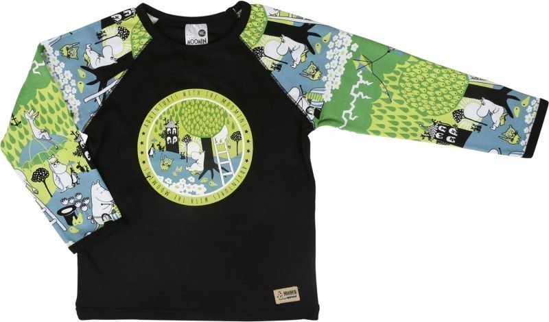 Musta Muumi-pusero, jossa kuviolliset hihat. Pitkähihaisessa puserossa on pyöreä pääntie ja se on valmistettu pehmeästä puuvillasekoitteesta. Edessä suurikokoinen Muumi-kuva. Materiaali: 95 % puuvilla, 5 % elastaani