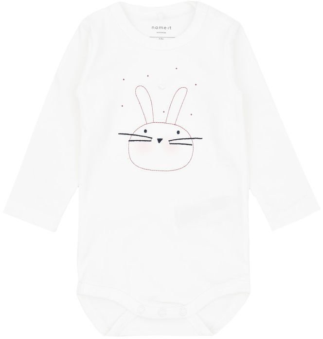 Name itin pitkähihainen body pehmeää ekopuuvillaa. Bodyssa on pyöreä pääntie sekä painonapit haarassa. Edessä herttainen pupuaiheinen applikointi. Materiaali: 95 % ekopuuvillaa, 5 % elastaania