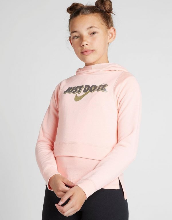 Give your street wardrobe a summer turnaround with this Girls’ Just Do It Crop Hoodie from Nike. Made from a soft cotton blend, the hoodie offers a comfortable and durable wear every time you step out and a ribbed hem and sleeve cuffs makes sure the fit is cosy and snug. With an adjustable hood offering extra coverage, a cropped cut, and coral pink colourway to ensure you stand out on the streets, the hoodie is finished with silver and gold Just Do It branding to the chest for a premium look.