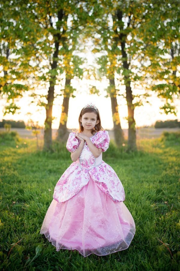 Pinkissä prinsessamekossa on puhvihihat ja tyllikoristeet. Ikäsuositus: 5–7-vuotiaille. Ostoksille!