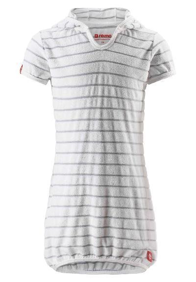 Ihanan pehmeä hupullinen Reima-mekko on valmistettu froteesta, joten se on erityisen kätevä käyttää uinnin jälkeen. Mukava materiaali suojaa myös auringolta, UV-suojakerroin on peräti 50+. Kiinteä huppu ja pehmeät joustoresorit hupussa, hihansuissa ja helmassa. Huippumukava ja trendikäs rantamekko – hittiainesta lomasesonkiin!