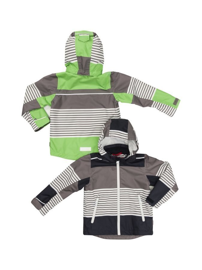 Kevyessä välikauden ulkoilutakissa on vetoketjuliinnitys ja irroitettava huppu. Edessä on kaksi vetoketjutaskua ja hihansuissa tarralliste säätöhihnat. Vettähylkivässä takissa on useita heijastinyksityiskohtia, jotka lisäävät turvallisuutta. Materiaali on 100 % polyesteriä, pintakalvo on 100 % polyuretaania. Konepesu 40 °C.