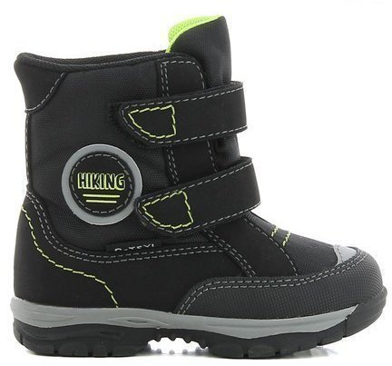 Sproxin tukevat talvikengät pienille jaloille. Mustissa kengissä on neonvihreät yksityiskohdat sekä heijastin kärjessä. Materiaali on polyuretaania ja nylonia. Korkeahko varsi ja karkeasti uritettu pohja tekevät kengästä tukevan. Kengissä on kolme helppokäyttöistä tarranauhaa. Materiaali: PU, nylon Vinkki! Kengän koko perustuu kengän sisämittaan. Oikean koon valitsemiseksi mittaa lapsen jalan pituus. Aseta paperi lattialle seinän viereen ja lapsen jalka paperille kantapää seinää vasten. Varmista, että lapsen paino jakaantuu tasaisesti jaloille, ja että lapsi ei nojaa seinään. Merkitse paperiin jalan pisin kohta. Mittaa lopuksi viivaimella merkin etäisyys paperin reunasta. Koska lapsen jalka kasvaa vauhdilla, kannattaa valita hieman lapsen jalkaa suurempi koko. Kasvuvaran tarve erilaisissa kengissä: Sandaalit: 10-15 mm Nilkkurit/saappaat: 15-20 mm Kävelykengät: 10-15 mm Urheilujalkineet: 10-15 mm Talvikengät: 15-20 mm Ensiaskelkengät: 15 mm Sisätossut: 10-15 mm Lapsen jalan kasvuvauhti keskimäärin: 1?2-vuotiaat: 20 mm/v. 2?3-vuotiaat: 15 mm/v. 3?11-vuotiaat: 10 mm/v.